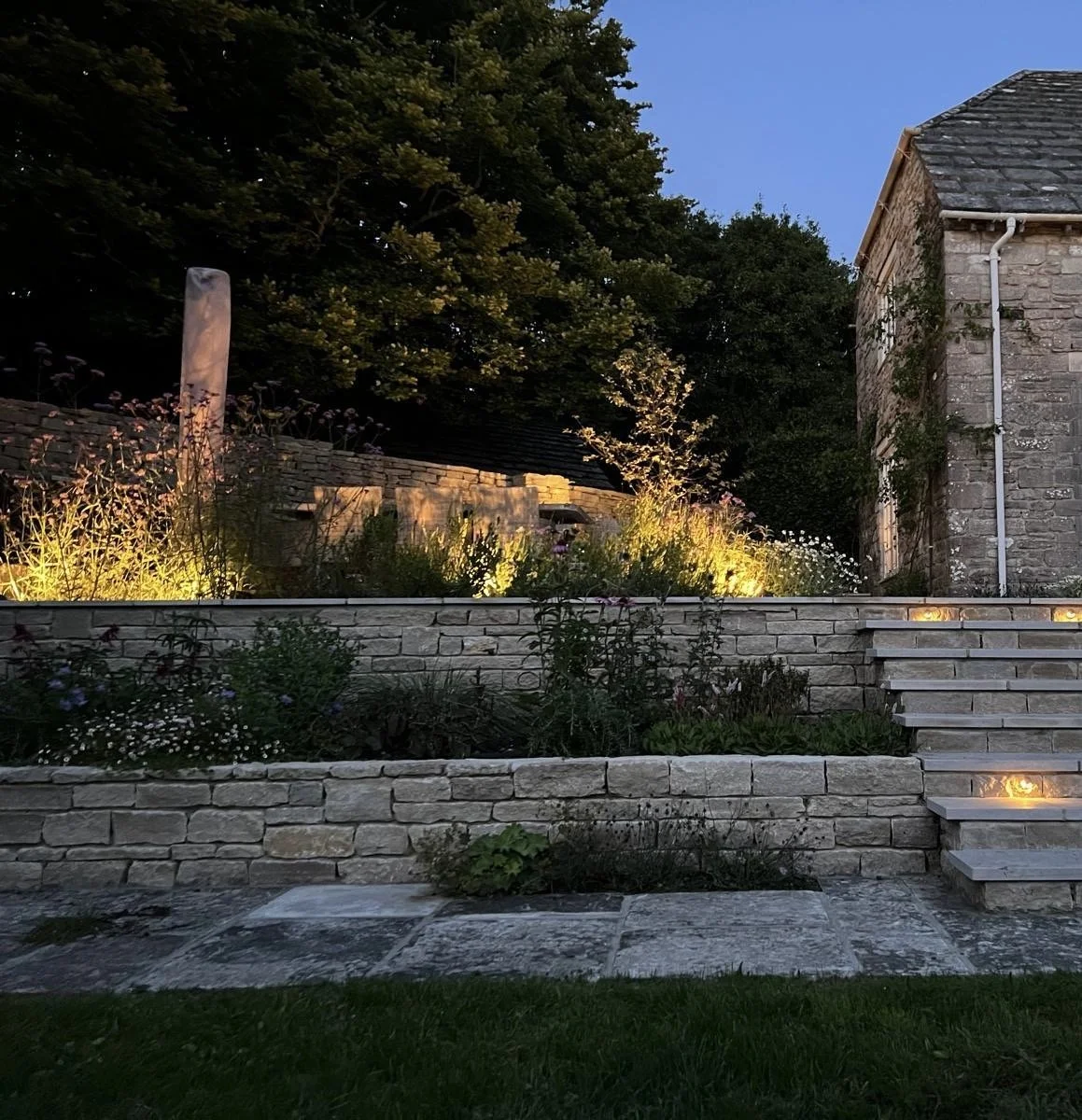 We did not want this rural garden to look over built so we incorporated as much planting as possible both in cut-outs on the terrace and in generous raised beds either side of the steps to soften the hard landscaping. We chose limestone paving and traditional walling and cobbles to ensure that the garden would blend with the house and not date. We also made sure to reuse all the paving that was already in the garden which helped to add an established feel to the space.